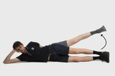 Lie on your side with your legs together. Keep your shoulders, hips and ankles in a straight line. Lift your upper leg off the other leg, aiming for a height of about 10 cm. Hold for 3 to 5 seconds as you are able, then slowly lower.