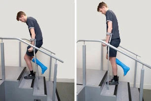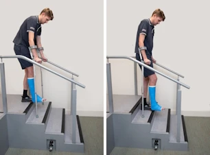 - Slowly lower your good leg down onto the step below, taking care not to put any weight on your affected leg.
