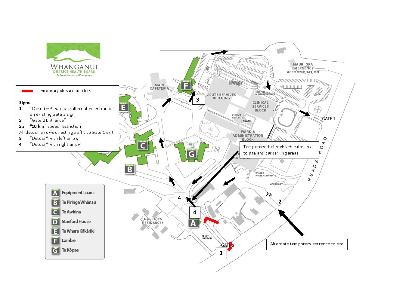 Access to car parks for the main and emergency entrances is via Gate 1 on Heads Road.